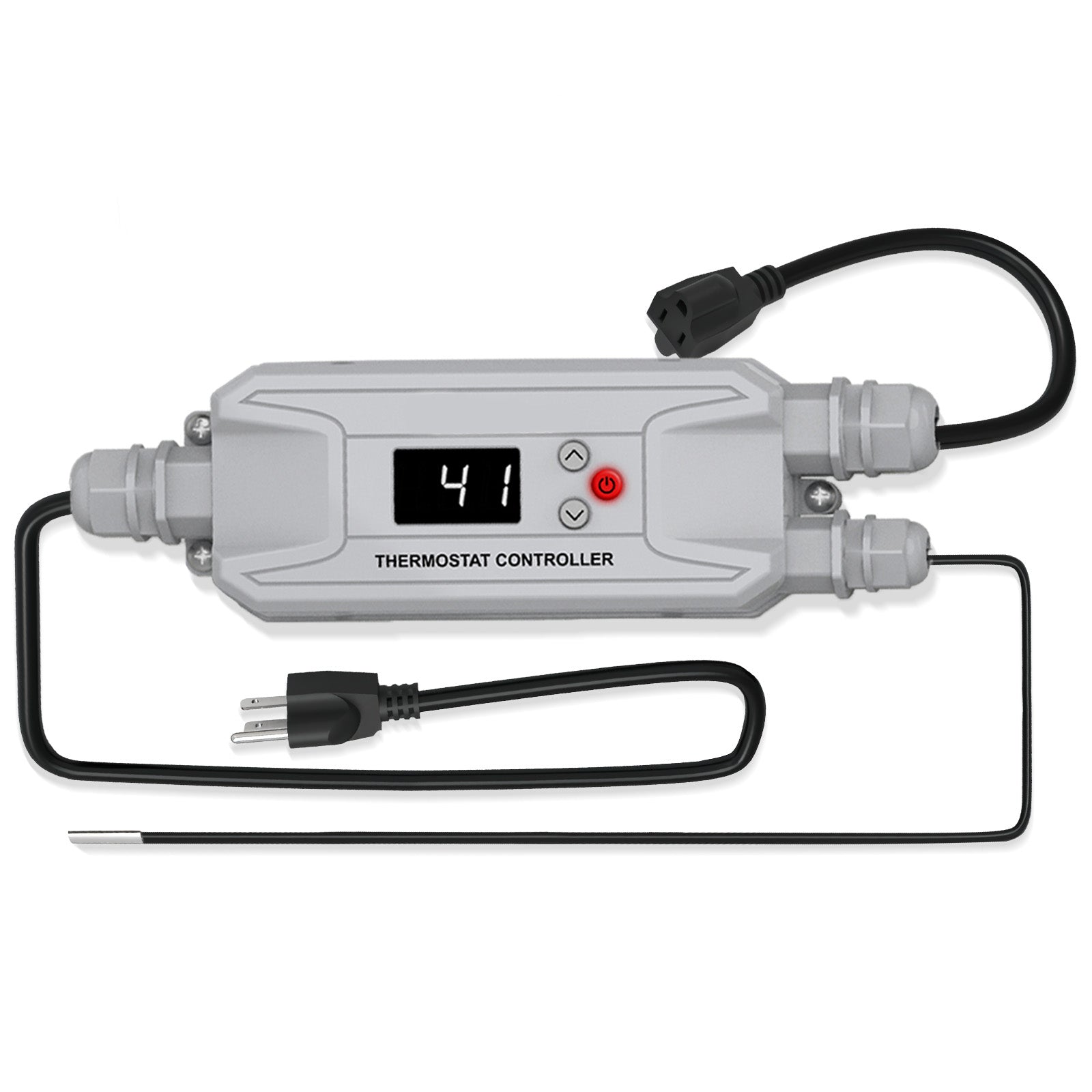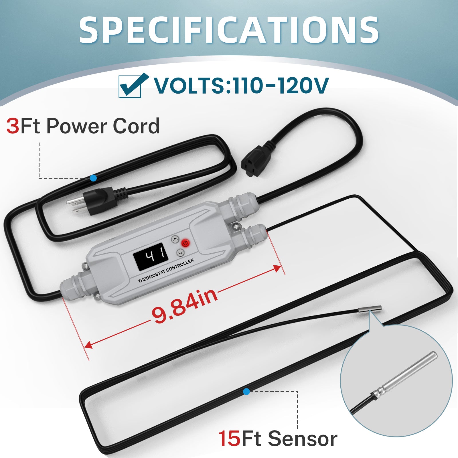 Adjustable thermostat for pipe heat tape, customizable temperature control, includes a 15 ft sensor