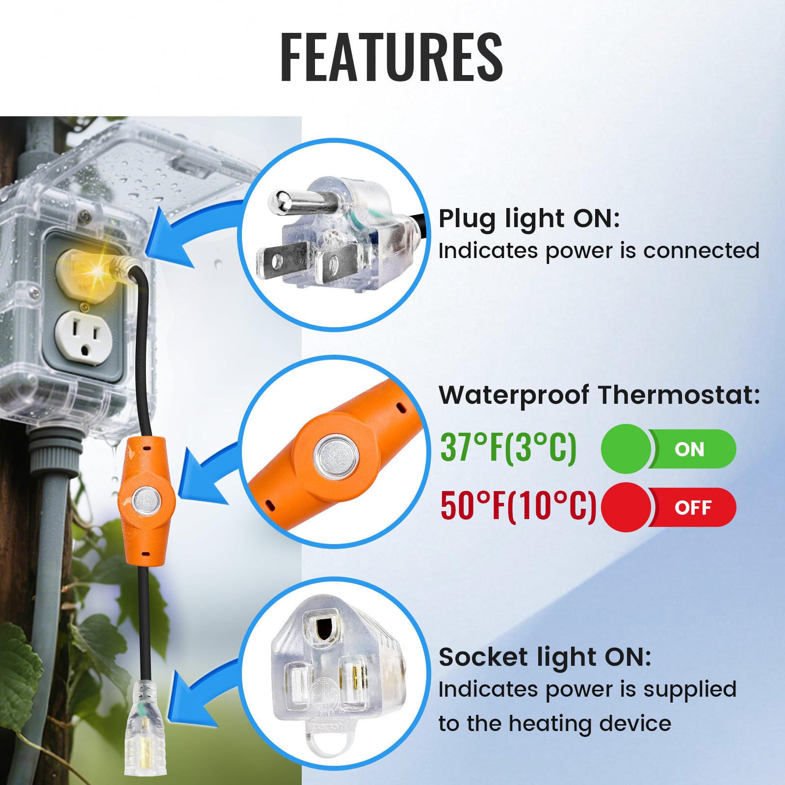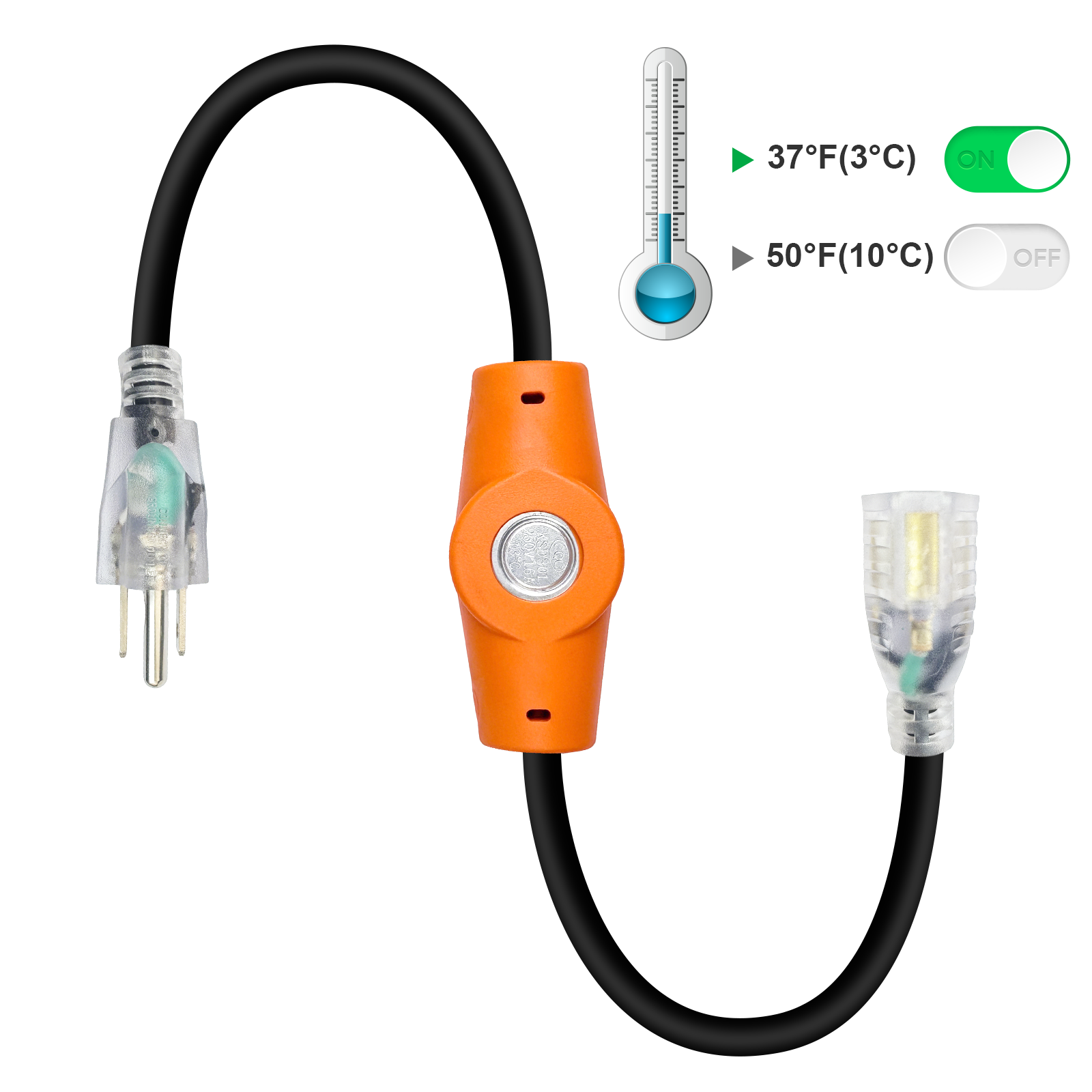 ● Smart Thermostat: Turns on below 38°F, off above 50°F.