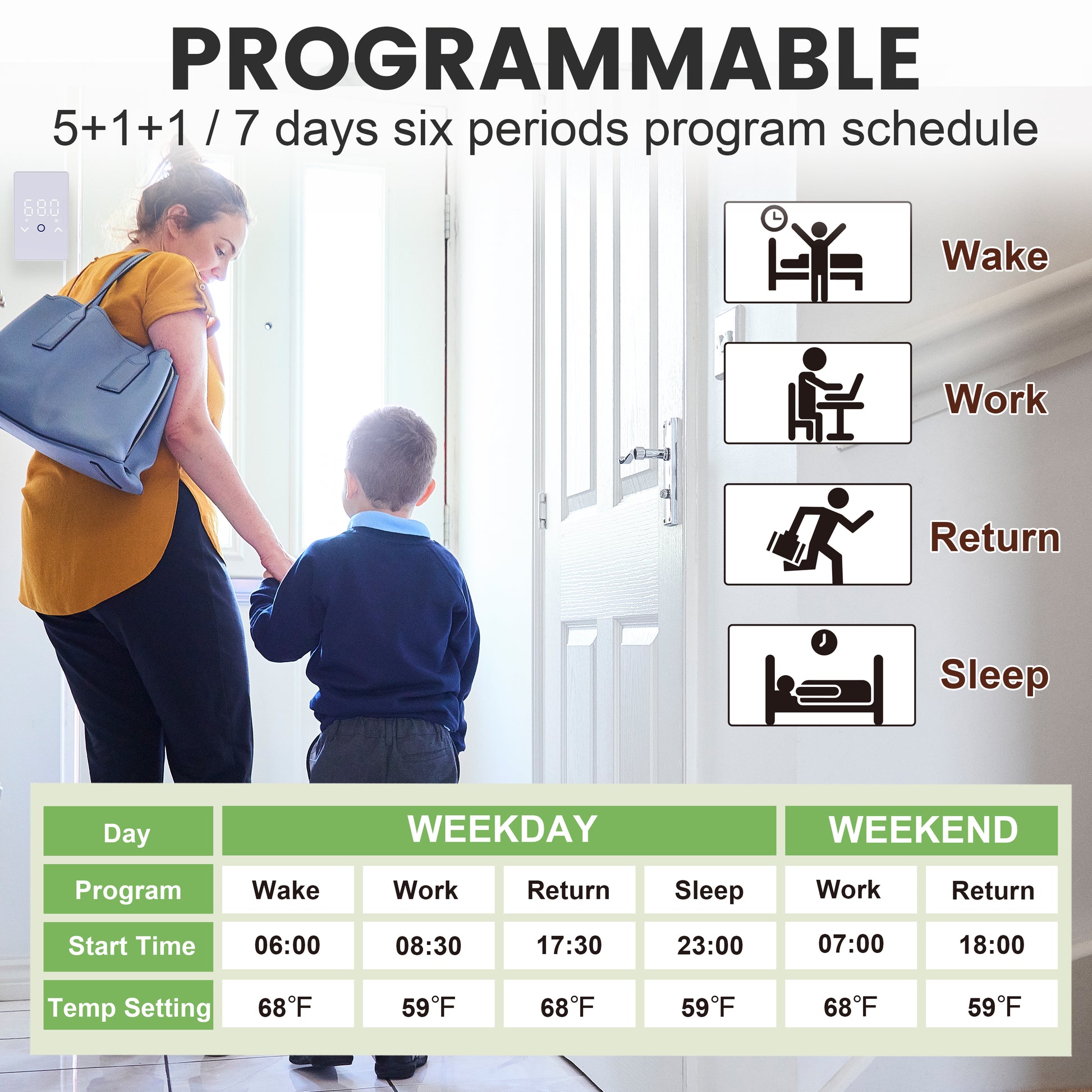 Smart Remote Control: Effortlessly manage your floor heating system from anywhere using your smartphone. Adjust the temperature on the go to ensure a warm and cozy home, no matter where you are. Plus, this thermostat for the wall can work with Alexa and Google Assistant for voice-activated convenience.